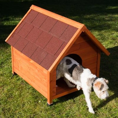 Caseta para perros fabricada con madera impermeabilizada de pino de explotación sostenible. Con techo a dos aguas de cartón asfaltado reforzado con saliente protector. Patas regulables.